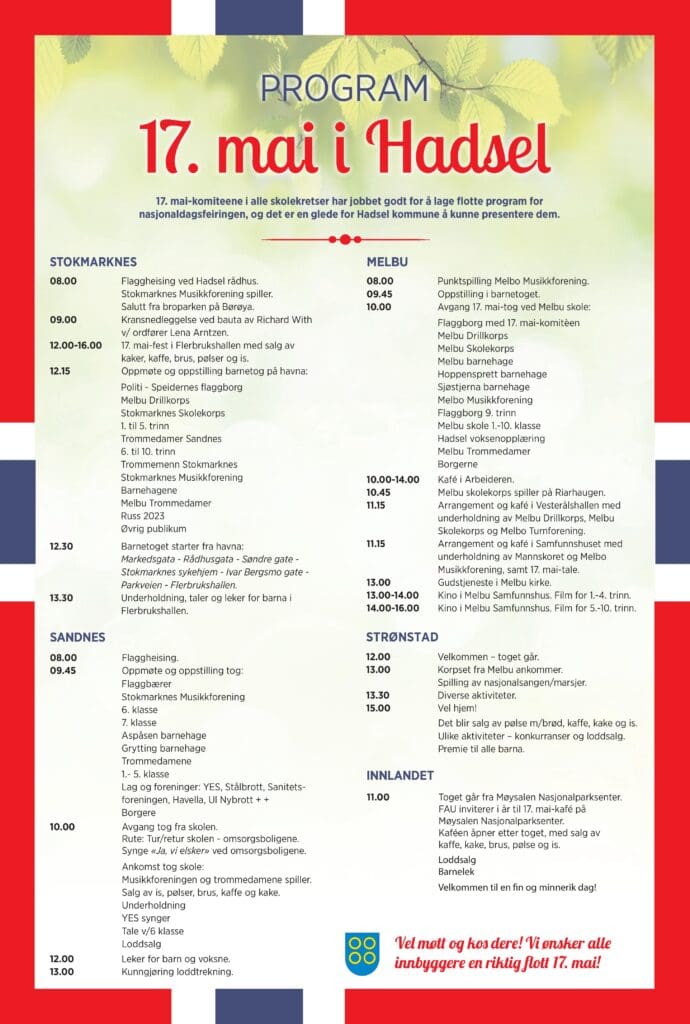 Du kan åpne og laste programmet ned som .pdf her: 17. mai Hadsel 2023