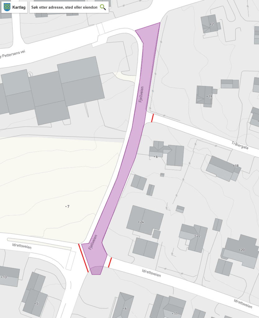 • Midlertidig, fra 4. august stenger vi Trålergata og Idrettsveien mot Fjellveien, og vi begynner å grave og legge rør fra krysset Idrettsveien/Fjellveien opp mot krysset Fjellveien/Mary Pettersens vei, som vist på bildet/skissen ovenfor. Vi åpner kryssene så snart arbeidene er fullført.