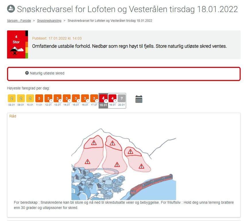 Fra og med tirsdag 18. januar er det stor snøskredfare i Vesterålen, Lofoten og store deler av Nordland.